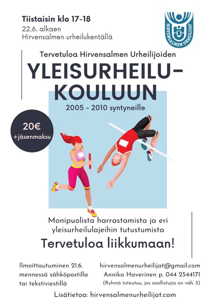 Lasten ja nuorten (2005-2010 syntyneiden) yleisurheilukoulu käynnistyy Hirvensalmen urheilukentällä tiistaina 22.6.2021 klo 17:00-18:00. Halutessaan myös nuoremmat voivat osallistua yleisurheilukouluun, jos he pärjäävät isompien mukana.