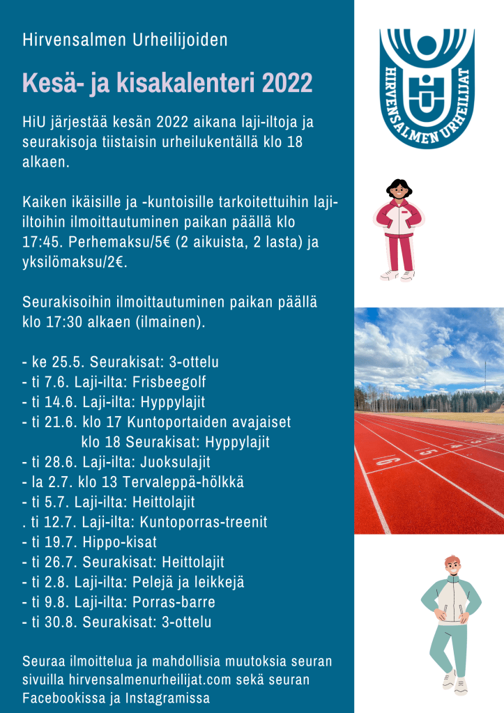 Hirvensalmen Urheilijat järjestää kesän 2022 aikana monipuolisia laji-iltoja, seurakisoja, Kuntoportaiden avajaiset, Tervaleppä-hölkän ja Hippo-kisat. Ota kesä- ja kisakalenteri talteen ja seuraa tarkempaa ilmoittelua täällä HiU:n nettisivuilla, Facebookissa ja Instagrammissa.