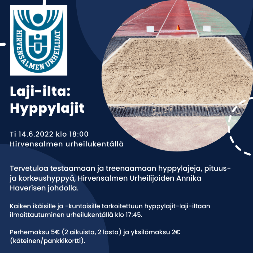 Tervetuloa tiistaina 14.6. klo 18 (ilmoittautuminen alkaa klo 17:45) hyppylajit-laji-iltaan Hirvensalmen urheilukentälle. Tervetuloa tutustumaan pituus- ja korkeushyppyyn mukavassa seurassa! Vetäjänä toimii Annika Haverinen. Tule yksin, perheen kanssa tai kaveriporukalla!