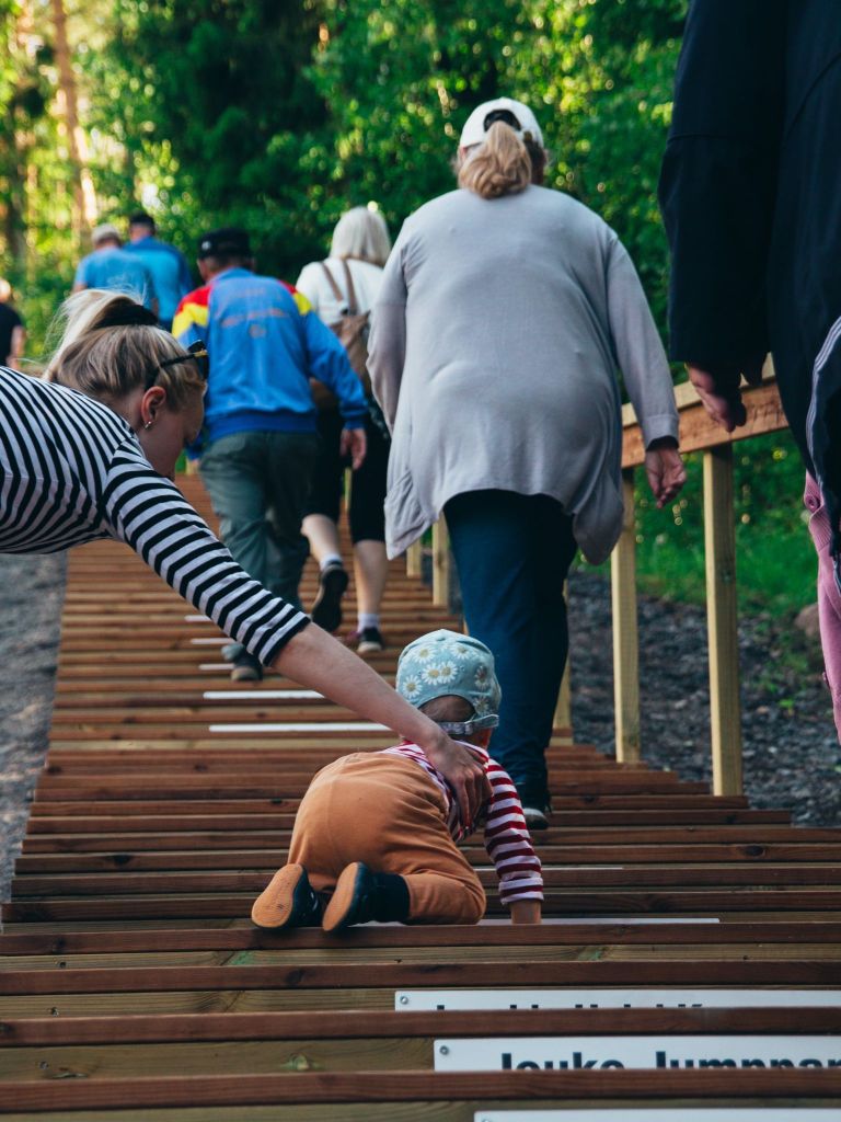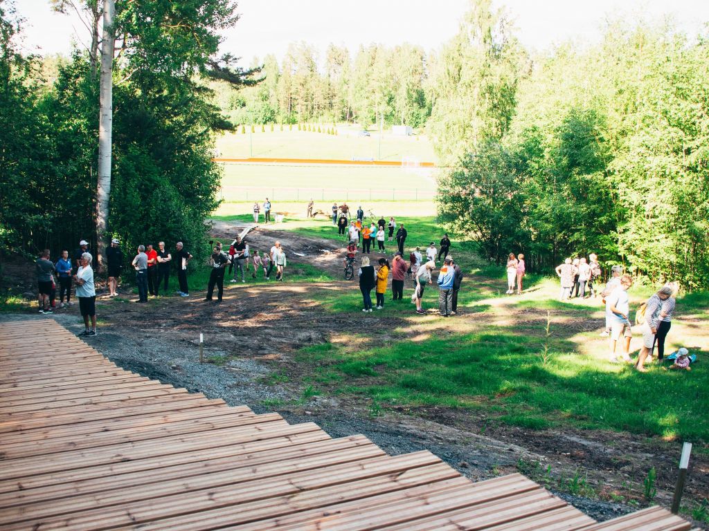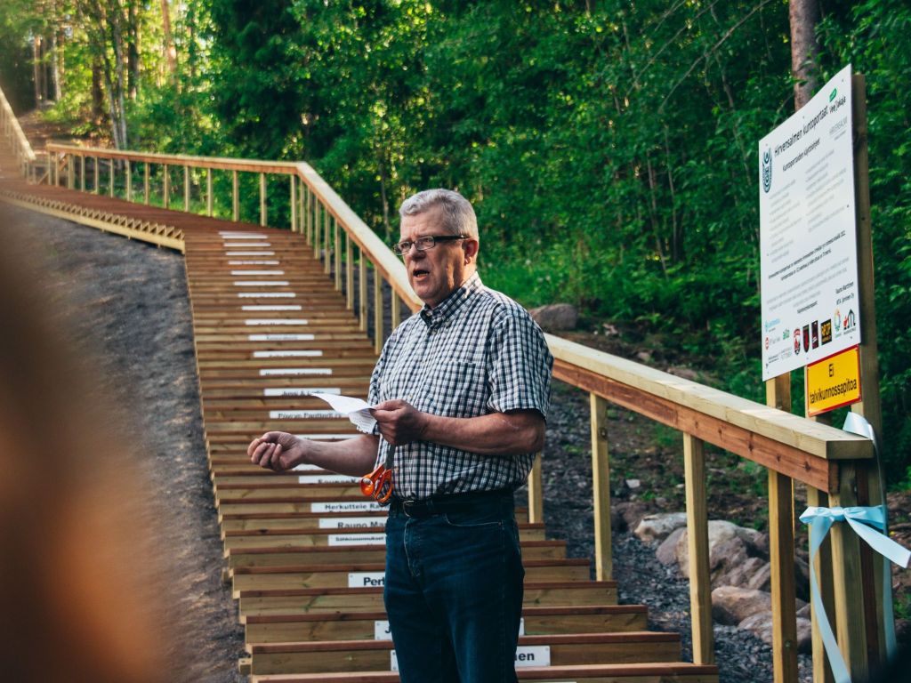 Kuntalaiset ja vapaa-ajan asukkaat pääsivät heti avajaispuheen jälkeen testaamaan upouusia kuntoportaita!