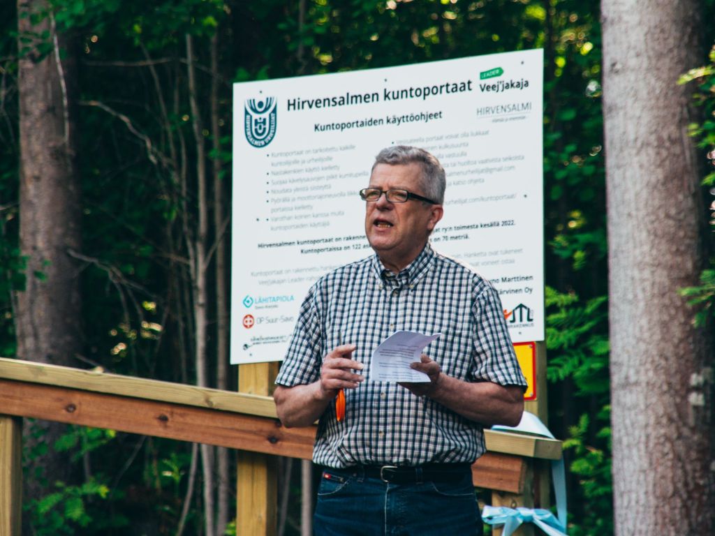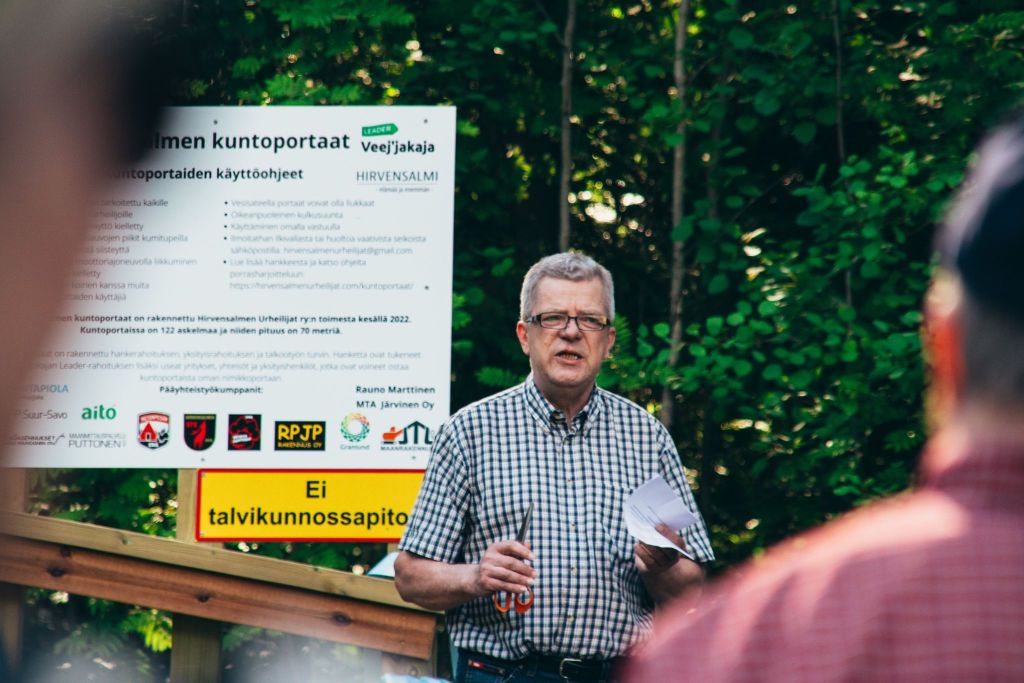 Hirvensalmen uusien kuntoportaiden avajaisia vietettiin tiistaina 21.6.2022 klo 17 alkaen Ukkomäessä. Paikalle oli saapunut noin 70 kuntalaista ja vapaa-ajan asukasta. Alussa Hirvensalmen Urheilijoiden puheenjohtaja Anu Palhomaa avasi tilaisuuden ja kertoi hieman porrashankkeesta ja sen etenemisestä sekä kiitti kaikkia hankkeeseen osallistuneita yrityksiä, yhdistyksiä ja yksityishenkilöitä unohtamatta Hirvensalmen kuntaa ja Veej’jakaja Leaderiä.