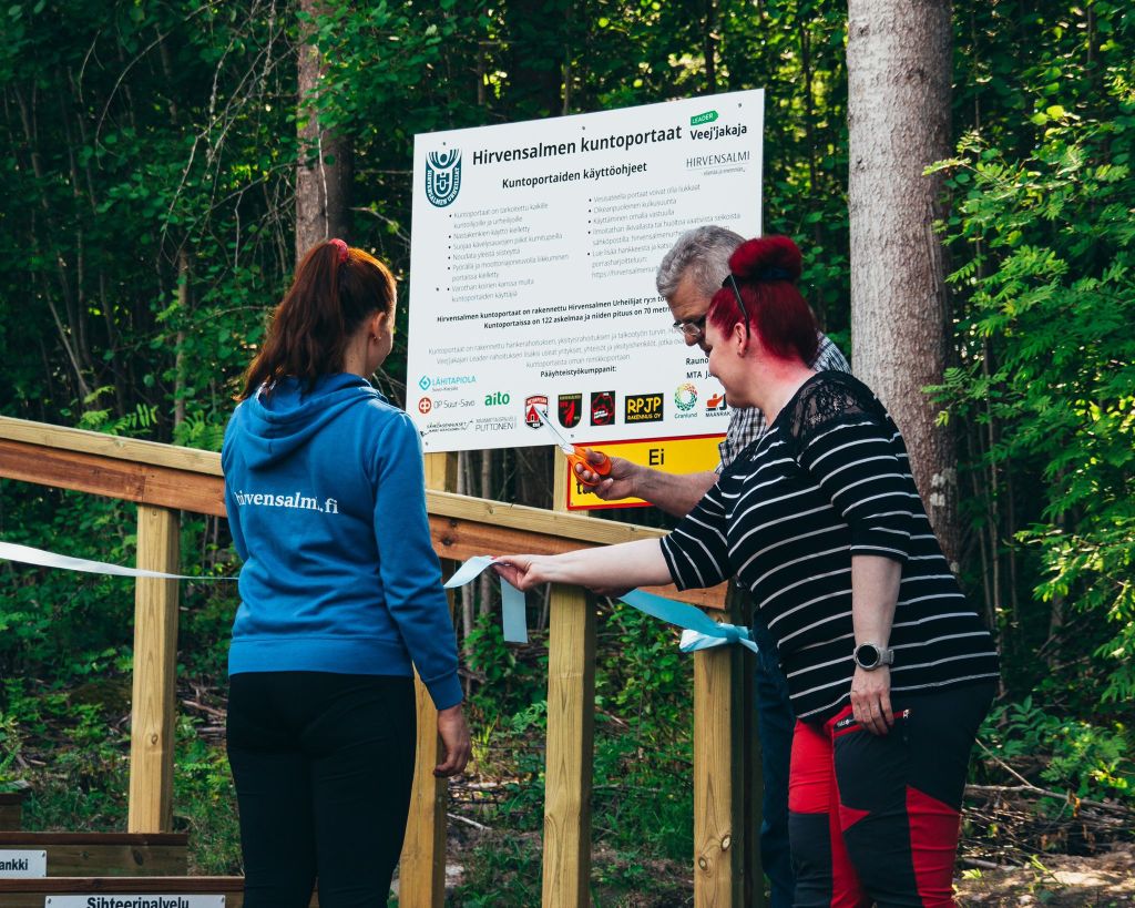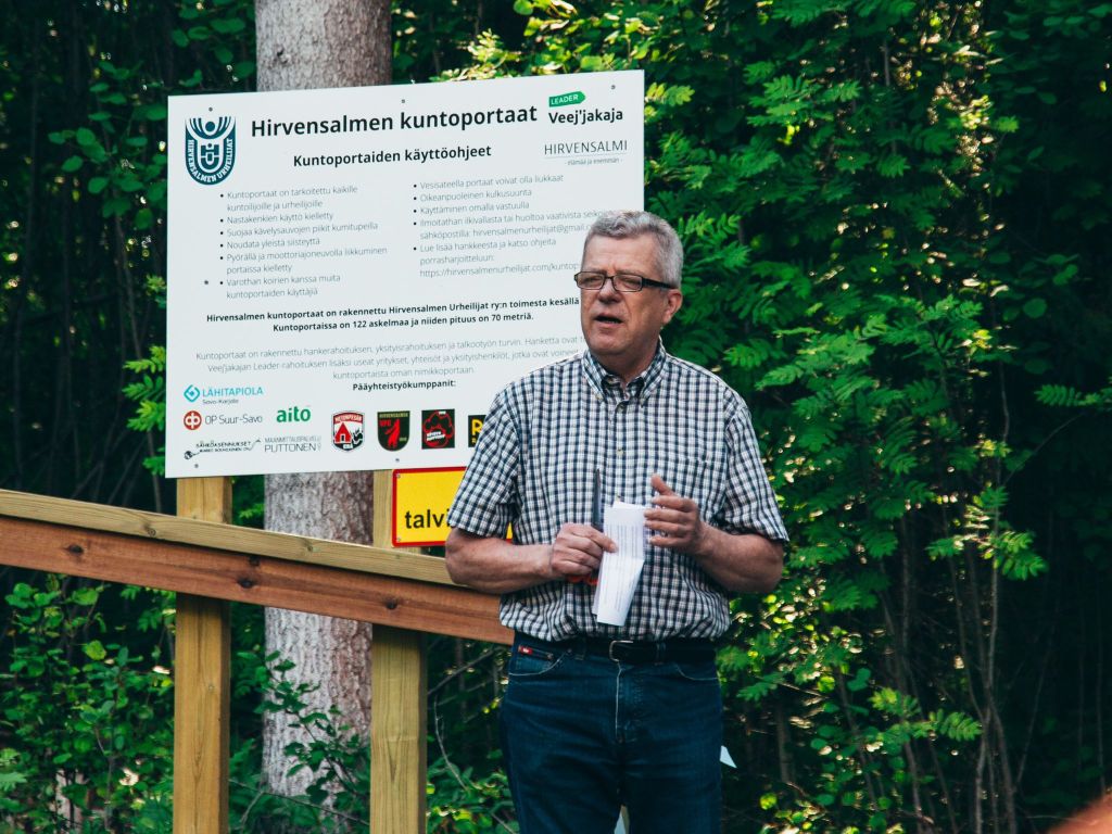 Hirvensalmen kuntoportaat avasi kunnanjohtaja Seppo Ruhanen ja hän piti tilaisuudessa myös kannustavan avajaispuheen, jossa kiitti Hirvensalmen Urheilijoita rohkeasta projektin toteuttamisesta. Seppo Ruhanen leikkasi avajaisnauhan yhdessä Anu Palhomaan, Kati Saltiolan ja Teemu Saltiolan kanssa.