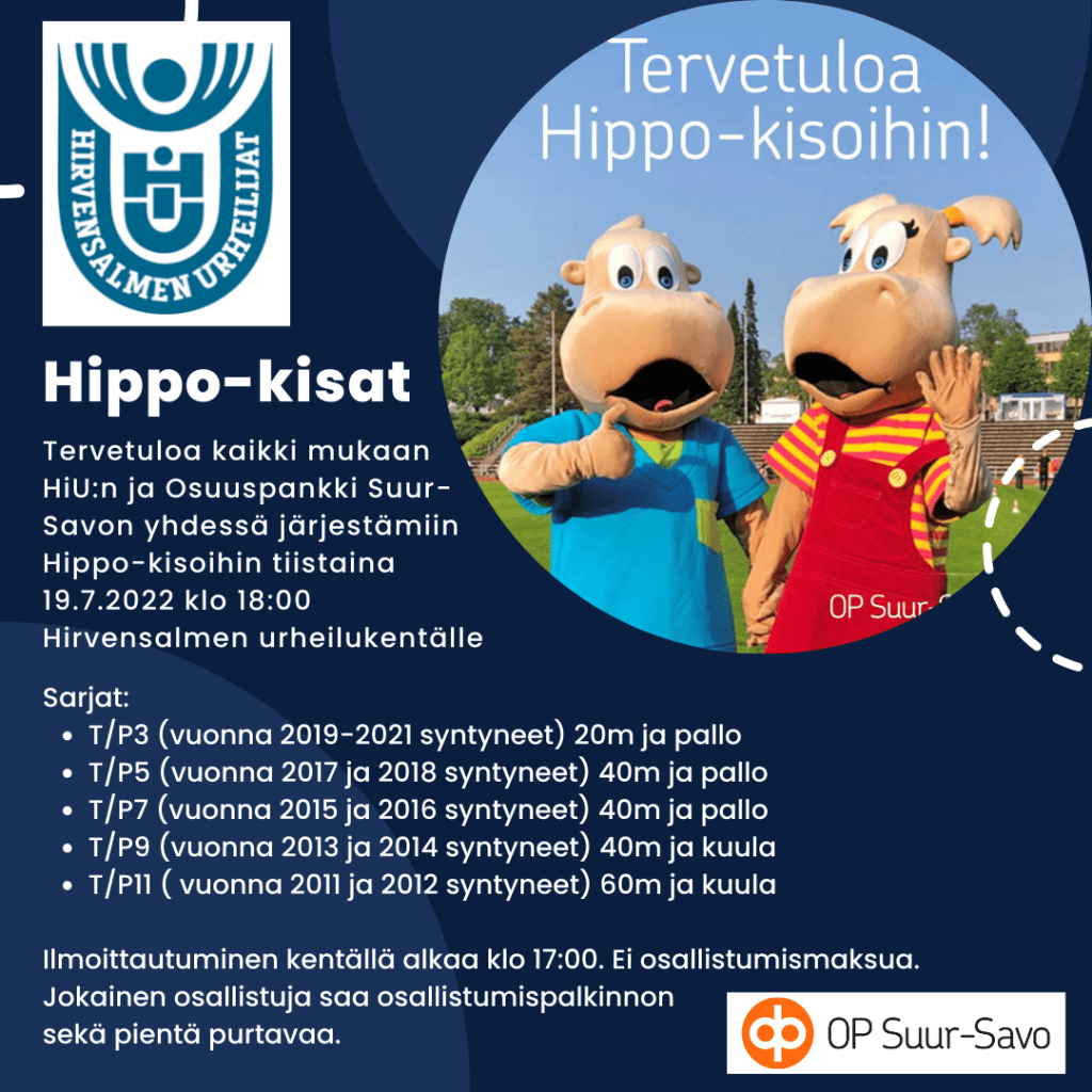 Tervetuloa kaikki mukaan HiU:n ja Osuuspankki Suur-Savon yhdessä järjestämiin Hippo-kisoihin tiistaina 19.7.2022 klo 18:00 Hirvensalmen urheilukentälle.