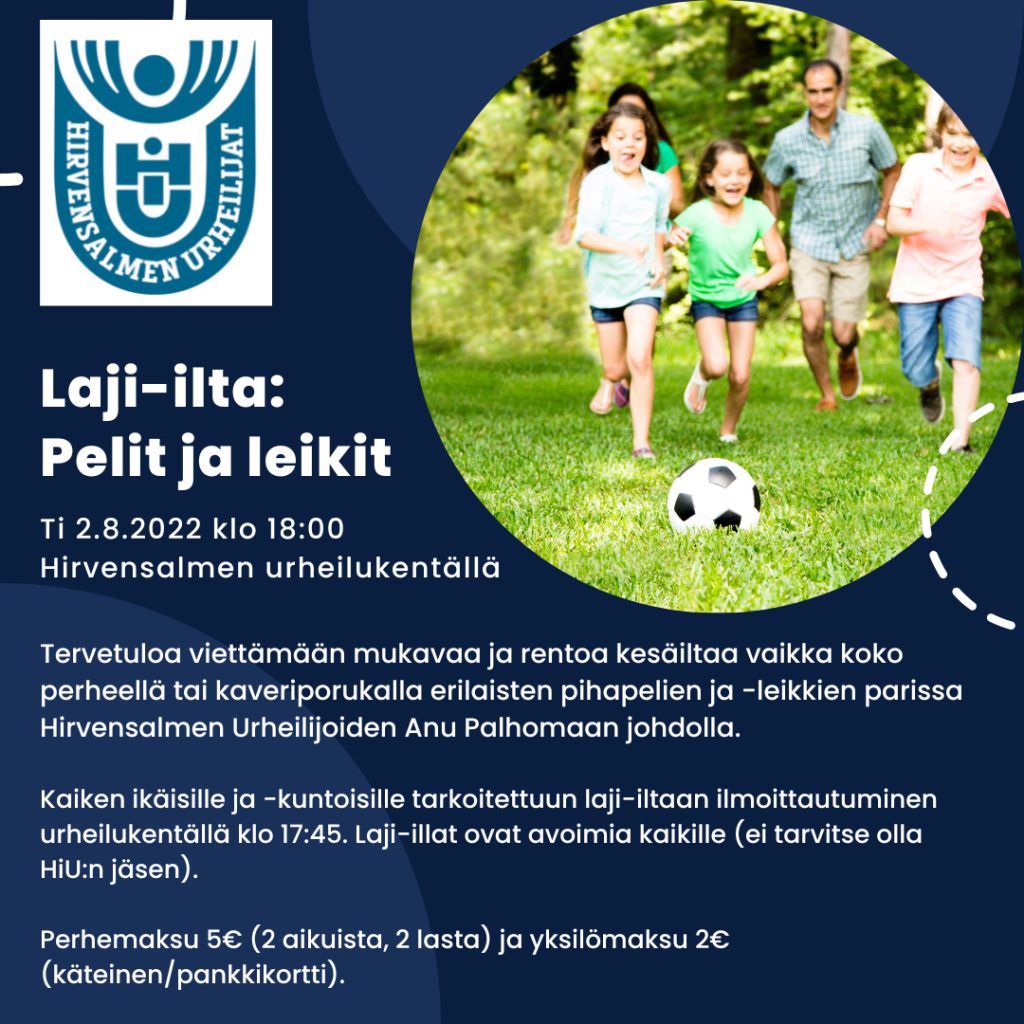Kaiken ikäisille ja -kuntoisille tarkoitettuun laji-iltaan ilmoittautuminen urheilukentällä klo 17:45. HiU:n laji-illat ovat avoimia kaikille (ei tarvitse olla HiU:n jäsen).