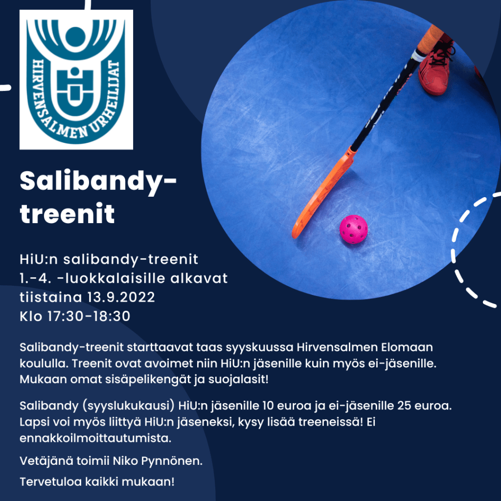 Hirvensalmen Urheilijoiden salibandy-treenit 1.-4. -luokkalaisille alkavat tiistain 13.9.2022 Elomaan koulun salissa klo 17:30-18:30.