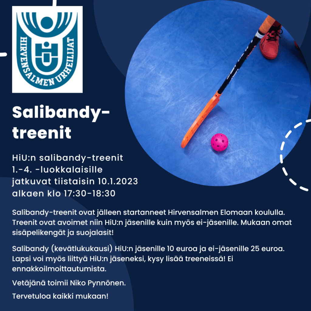Salibandy-treenit ovat jälleen startanneet Hirvensalmen Elomaan koululla. Treenit ovat avoimet niin HiU:n jäsenille kuin myös ei-jäsenille. Mukaan omat sisäpelikengät ja suojalasit!