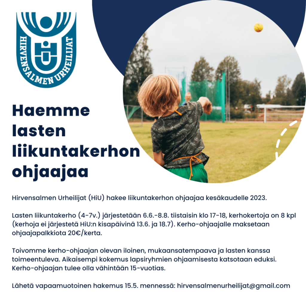 Hirvensalmen Urheilijat (HiU) hakee lasten liikuntakerhon ohjaajaa kesäkaudelle 2023.