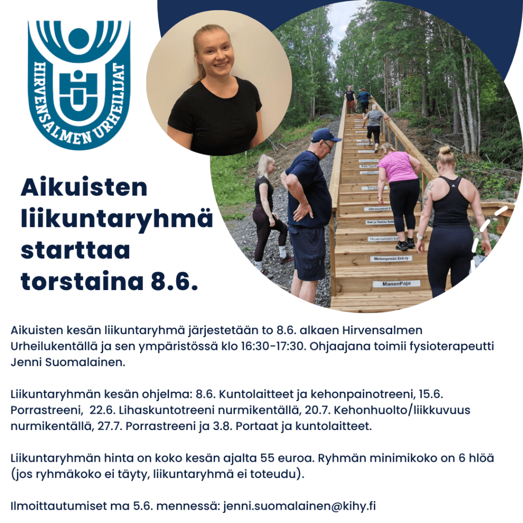 Aikuisten kesän liikuntaryhmä järjestetään to 8.6. alkaen Hirvensalmen Urheilukentällä ja sen ympäristössä klo 16:30-17:30. Ohjaajana toimii fysioterapeutti Jenni Suomalainen.