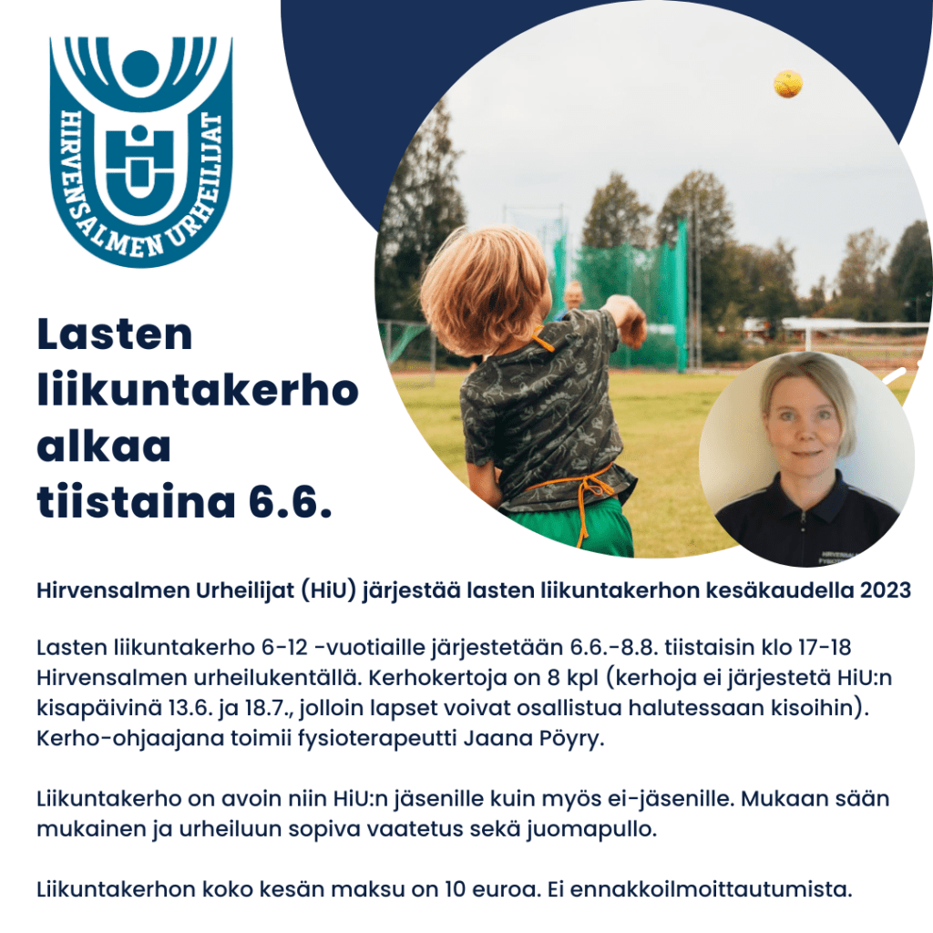 Lasten liikuntakerho 6-12 -vuotiaille järjestetään 6.6.-8.8. tiistaisin klo 17-18 Hirvensalmen urheilukentällä. Kerhokertoja on 8 kpl (kerhoja ei järjestetä HiU:n kisapäivinä 13.6. ja 18.7., jolloin lapset voivat osallistua halutessaan kisoihin). Kerho-ohjaajana toimii fysioterapeutti Jaana Pöyry.