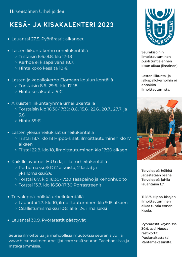 HiU:n kesä- ja kisakalenteri 2023 Kirjoittanuthirvensalmenurheilijat202019.6.2023Kategoria(t):Yleinen Jaa: Jaa X:ssä(Avautuu uudessa ikkunassa) X Jaa Facebookissa(Avautuu uudessa ikkunassa) Facebook Tykkää Lataa... Aiheeseen liittyy