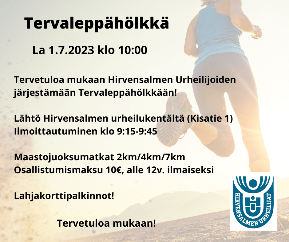 Hirvensalmen Tervaleppäjuhlat ja Tervaleppähölkkä lähestyvät! Tervetuloa kaikki lauantaina 1.7.2023 klo 10:00 Tervaleppähölkkään! Lähtö Hirvensalmen Urheilukentältä. Ilmoittautuminen klo 9:15-9:45.