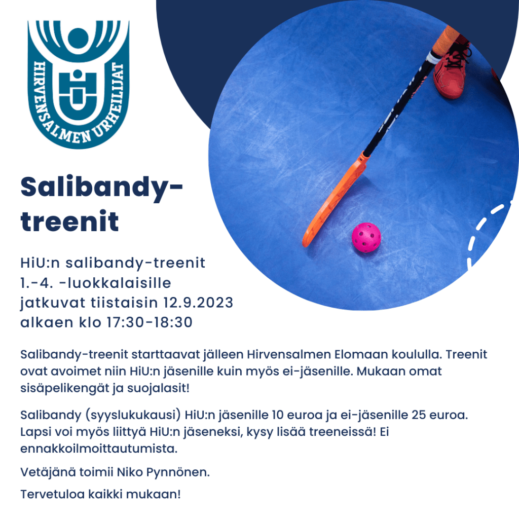 Salibandy-treenit starttaavat jälleen Hirvensalmen Elomaan koululla. Treenit ovat avoimet niin HiU:n jäsenille kuin myös ei-jäsenille. Mukaan omat sisäpelikengät ja suojalasit!