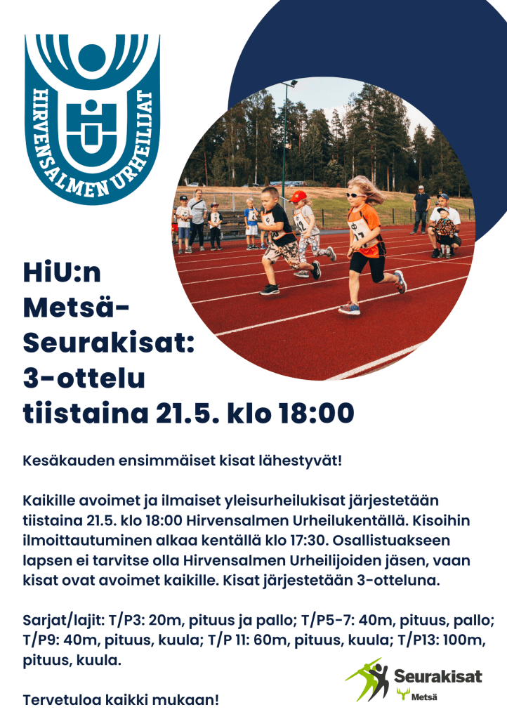 Kaikille avoimet ja ilmaiset lasten yleisurheilukisat järjestetään tiistaina 21.5. klo 18:00 Hirvensalmen Urheilukentällä. Kisoihin ilmoittautuminen alkaa kentällä klo 17:30. Osallistuakseen lapsen ei tarvitse olla Hirvensalmen Urheilijoiden jäsen, vaan kisat ovat avoimet kaikille. Kisat järjestetään 3-otteluna.