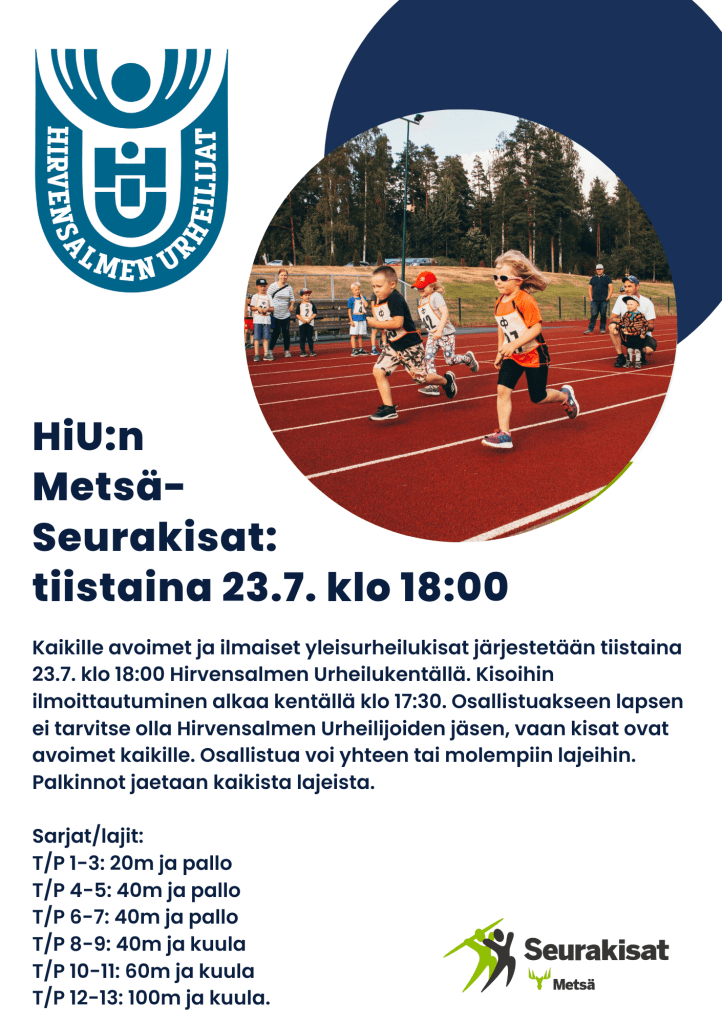 Ensi viikon tiistaina 23.7. klo 18:00 järjestetään taas lasten yleisurheilukisat Hirvensalmen urheilukentällä! Kaikki joukolla mukaan! Ilmoittautuminen alkaa klo 17.30.