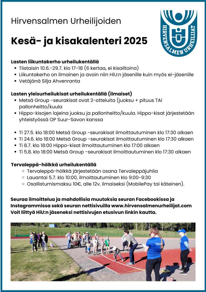 HiU:n kesäkalenteri on nyt julkaistu! Kirjoittanuthirvensalmenurheilijat20206.5.2025Kategoria(t):Yleinen Tervetuloa osallistumaan! Ensimmäiset lasten yu-kisat ti 27.5. Lasten liikuntakerhoon ilmoittautuminen alkaa N-Y-T osoitteeseen: hirvensalmenurheilijat@gmail.com Muista laittaa kalenteriin myös Tervaleppä-hölkkä la 5.7. Jaa: Jaa X:ssä(Avautuu uudessa ikkunassa) X Jaa Facebookissa(Avautuu uudessa ikkunassa) Facebook Tykkää Lataa... Aiheeseen liittyy