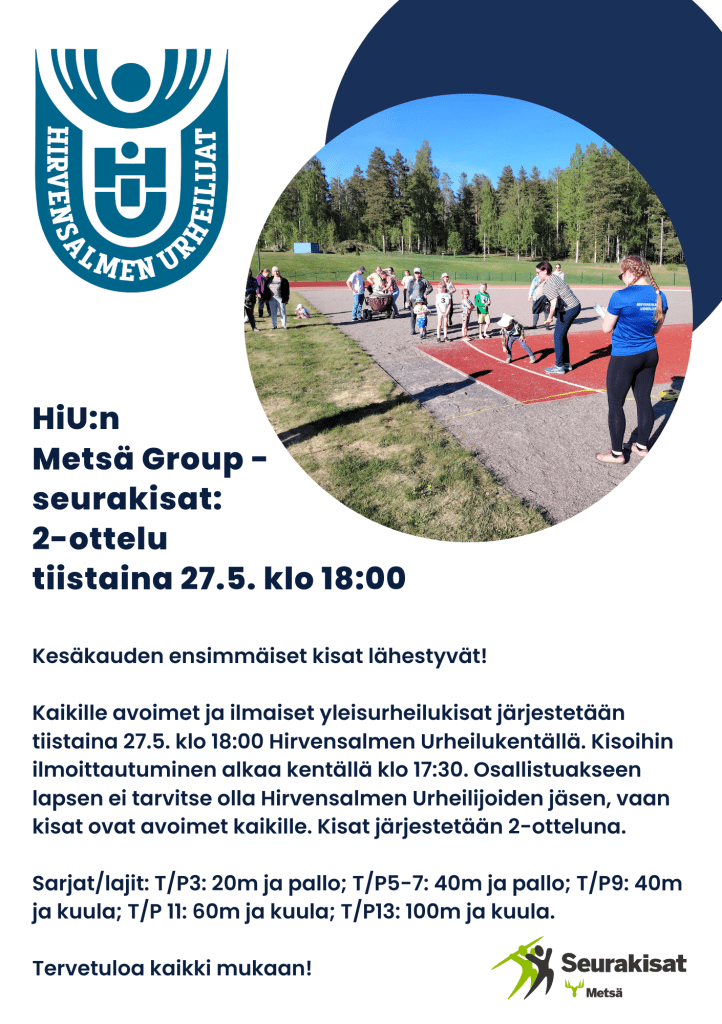 Kaikille avoimet ja ilmaiset yleisurheilukisat järjestetään tiistaina 27.5. klo 18:00 Hirvensalmen Urheilukentällä. Kisoihin ilmoittautuminen alkaa kentällä klo 17:30. Osallistuakseen lapsen ei tarvitse olla Hirvensalmen Urheilijoiden jäsen, vaan kisat ovat avoimet kaikille. Kisat järjestetään 2-otteluna.