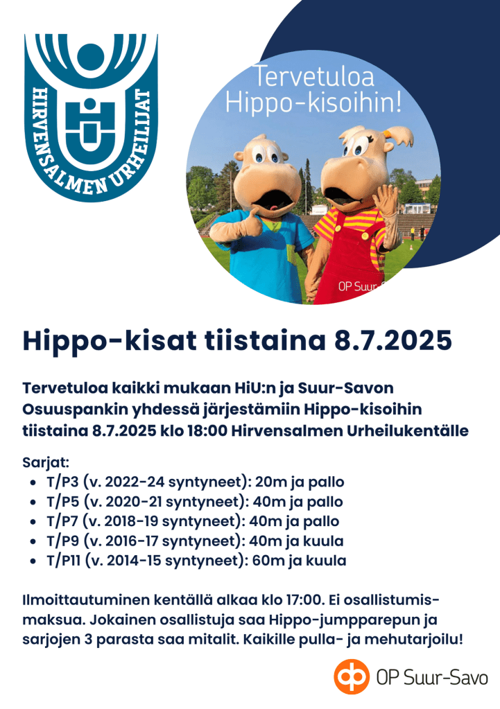 Tervetuloa kaikki mukaan HiU:n ja Suur-Savon Osuuspankin yhdessä järjestämiin Hippo-kisoihin tiistaina 8.7.2025 klo 18:00 Hirvensalmen Urheilukentälle