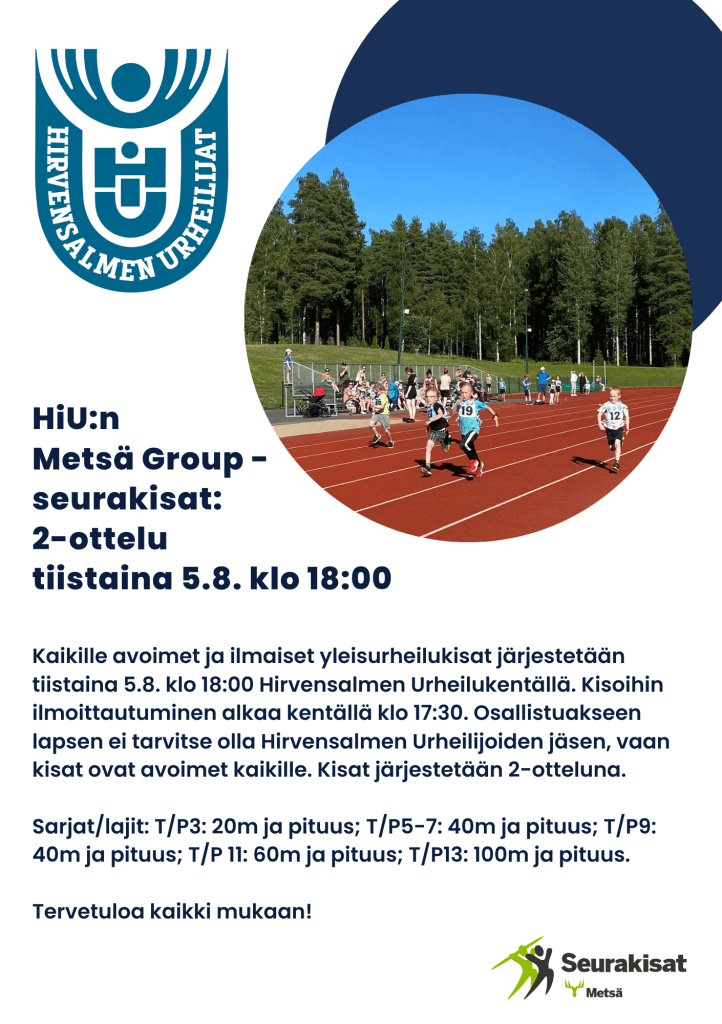 Kaikille avoimet ja ilmaiset yleisurheilukisat järjestetään tiistaina 5.8. klo 18:00 Hirvensalmen Urheilukentällä. Kisoihin ilmoittautuminen alkaa kentällä klo 17:30. Osallistuakseen lapsen ei tarvitse olla Hirvensalmen Urheilijoiden jäsen, vaan kisat ovat avoimet kaikille. Kisat järjestetään 2-otteluna.