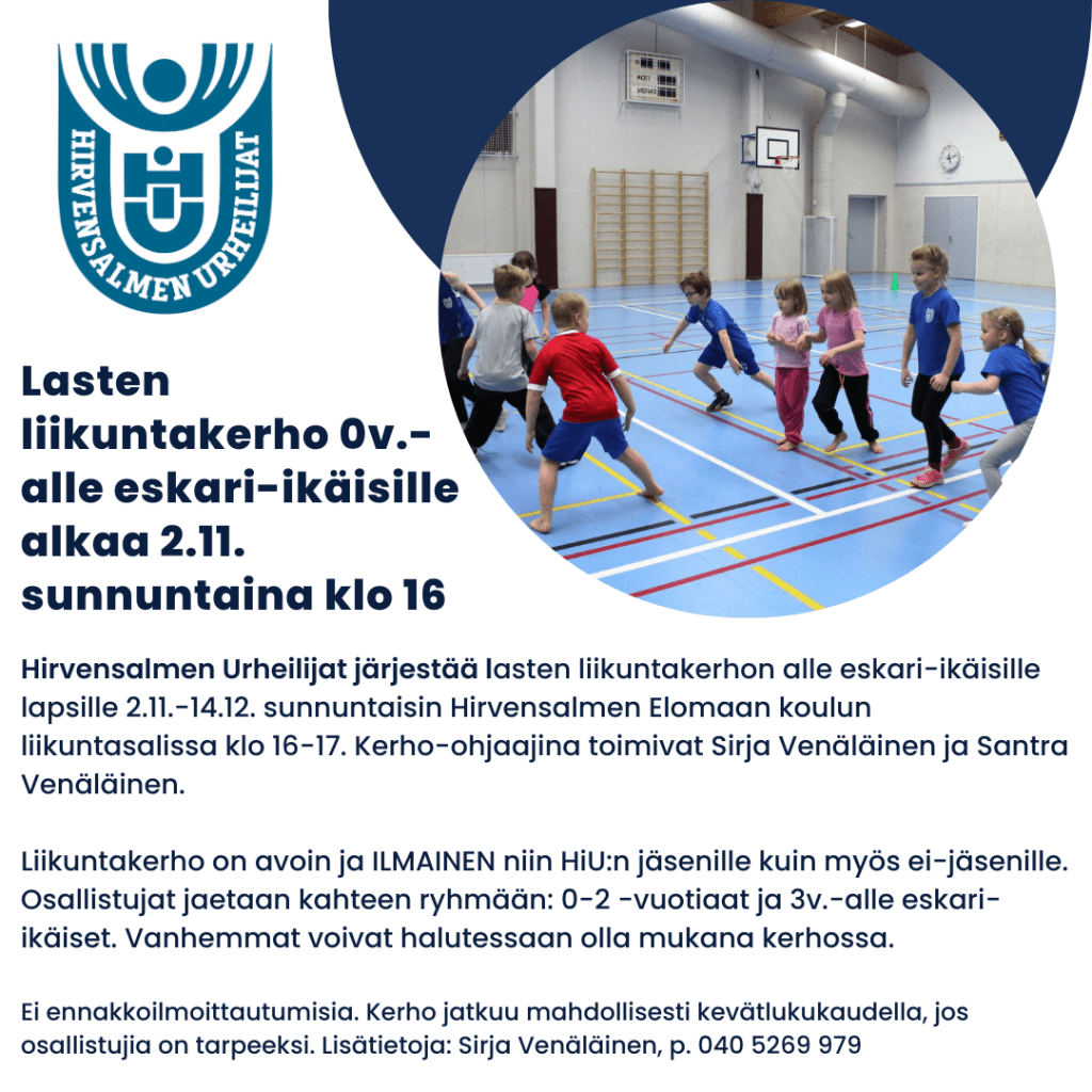 Hirvensalmen Urheilijat järjestää lasten liikuntakerhon alle eskari-ikäisille lapsille 2.11.-14.12. sunnuntaisin Hirvensalmen Elomaan koulun liikuntasalissa klo 16-17. Kerho-ohjaajina toimivat Sirja Venäläinen ja Santra Venäläinen.