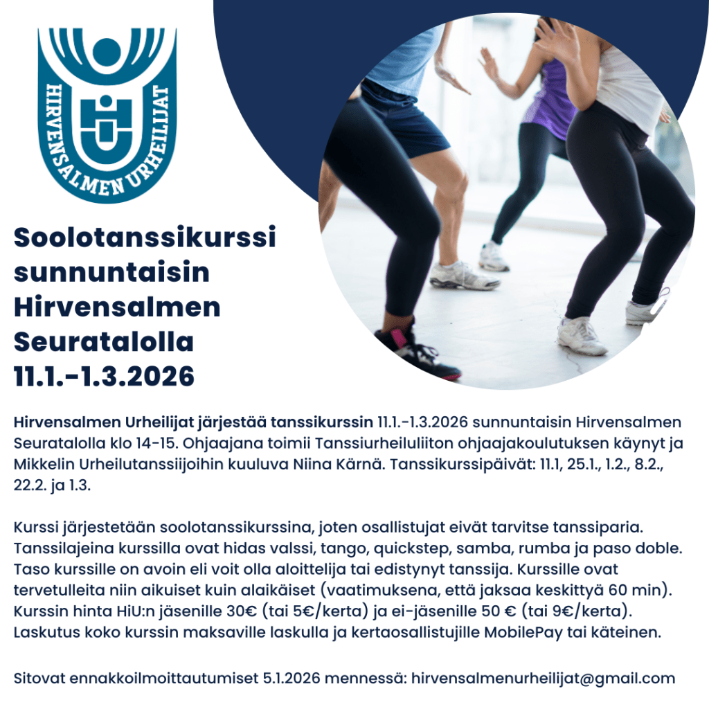 Soolotanssikurssi 11.1.-1.3.2026 Kirjoittanuthirvensalmenurheilijat202013.1.2026Kategoria(t):Yleinen Jaa: Jaa X:ssä(Avautuu uudessa ikkunassa) X Jaa Facebookissa(Avautuu uudessa ikkunassa) Facebook Tykkää Lataa... Aiheeseen liittyy