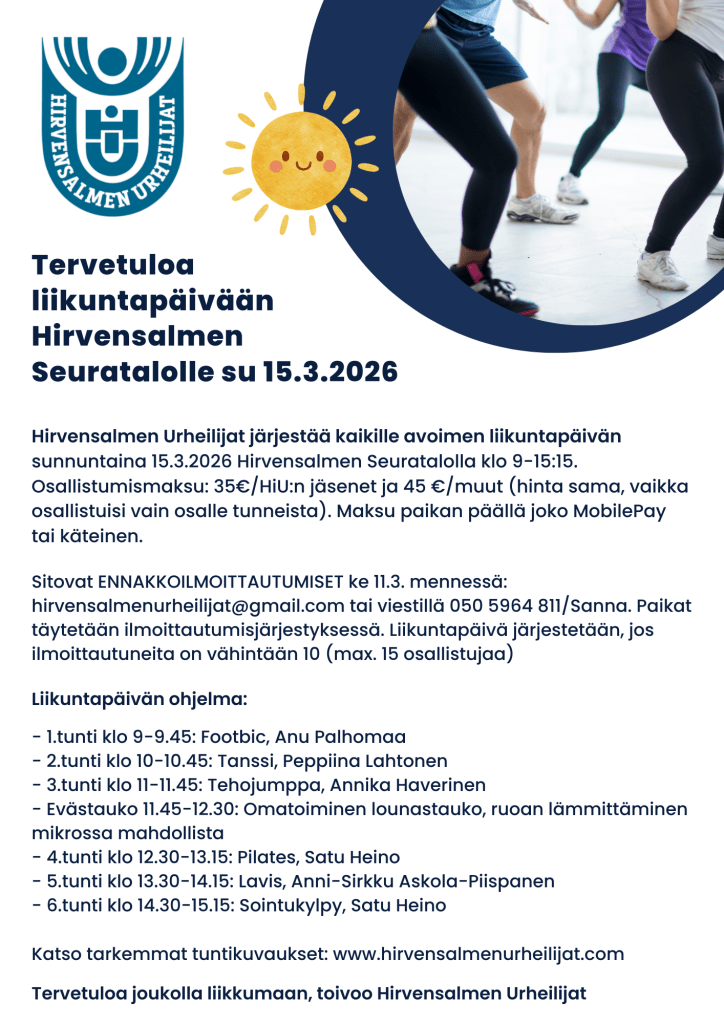 Hirvensalmen Urheilijat järjestää kaikille avoimen liikuntapäivän sunnuntaina 15.3.2026 Hirvensalmen Seuratalolla klo 9-15:15. Osallistumismaksu: 35€/HiU:n jäsenet ja 45 €/muut (hinta sama, vaikka osallistuisi vain osalle tunneista). Maksu paikan päällä joko MobilePay tai käteinen.